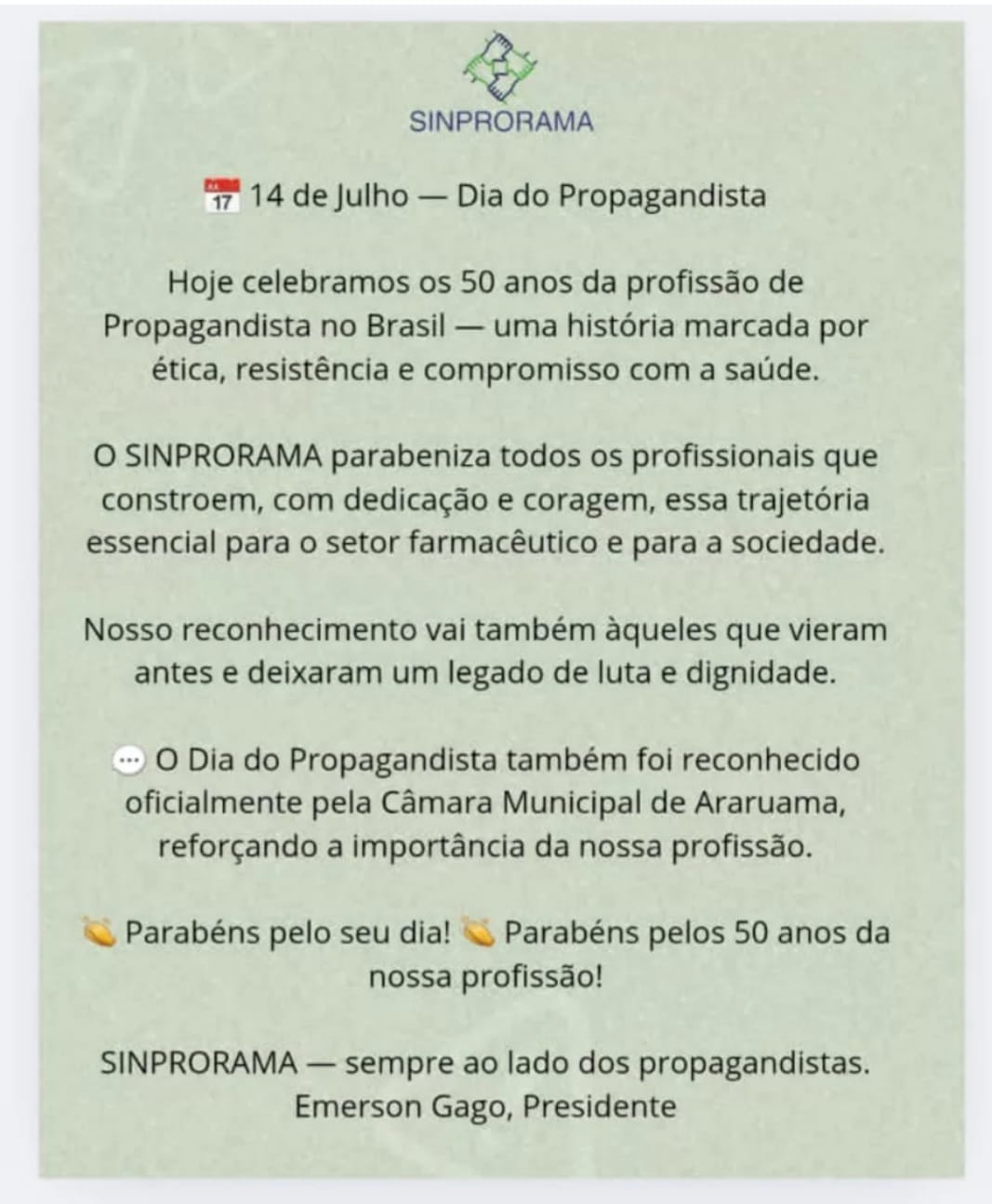 Em Assembleia Geral, que aconteceu no dia 14 de julho de 2014 (data em que se comemora o DIA DO PROPAGANDISTA) no salão nobre do Restaurante Bela Bel, situado à Avenida Brasil, nº 71, Centro – Araruama-RJ, foi então fundado o SINPRORAMA, com eleição e posse de sua Diretoria.
